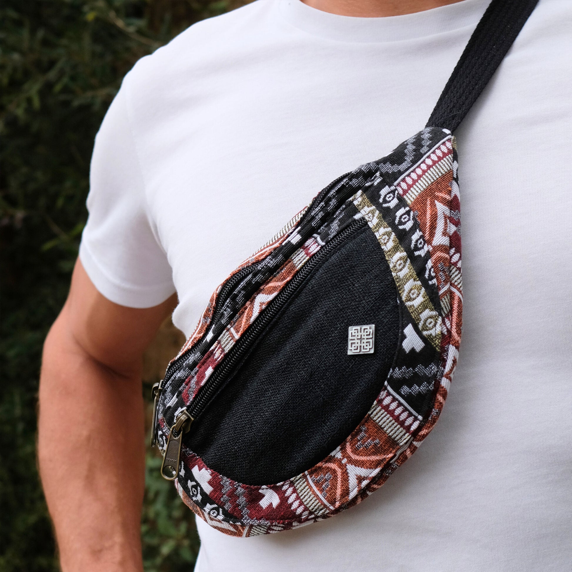 The unique ethnic patterns make this vintage hemp fanny pack a very special eye-catcher. The hippie bag cleverly combines a woven ethno pattern with black hemp. The patterns are simple but colorful and are perfect as a belt bag for men and women. The Goa Hippie bag is with three practical closable pockets a perfect addition to your festival clothes.